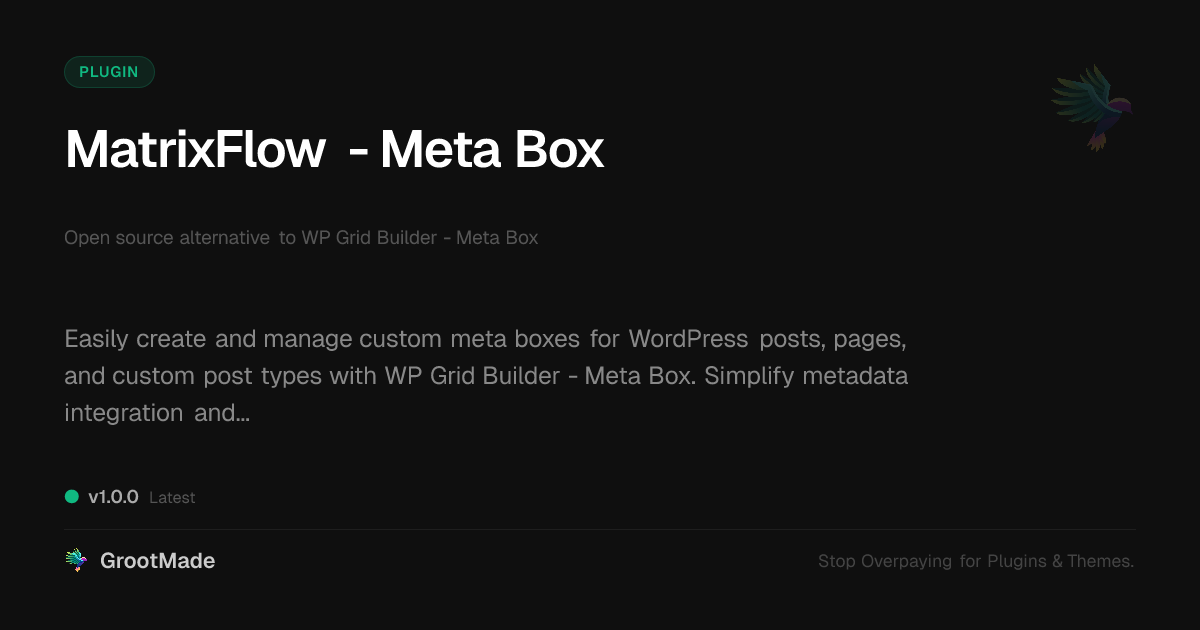 | Tags | custom post types, layout builder, dynamic content, meta box, gallery plugin development, grid builder, firewall for websites, static site generator theme, Developer Tools, Email List, Advanced Customization, WP plugin, content management, directory comparison, custom fields, WP community tools, member communication plugin |