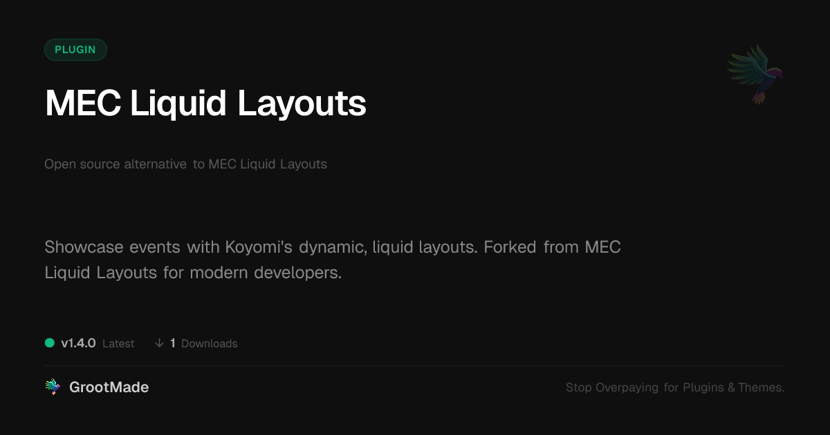 | Tags | responsive design, dynamic content, page builder, event calendar plugin, elementor, web design, adaptive design, gutenberg, layout manager, flexible layouts, event listing design, liquid event layouts, responsive event displays, WP community tools, php script repository, Liquid Layouts, user role visibility, member communication plugin, modern event presentation |