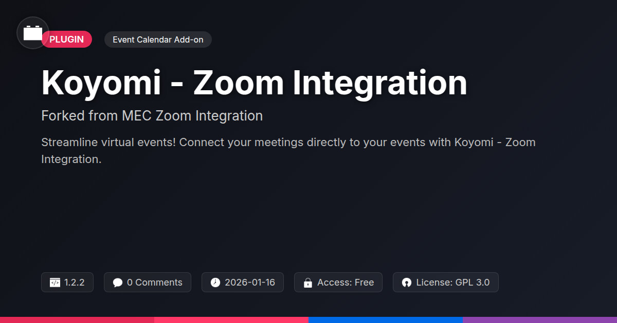 | Tags | open source solutions, event calendar add-on, virtual event management, online events, online meeting integration, developer tools plugin, Calendar, Virtual Events, Zoom, Meetings, Webinar, Mec, Digital Downloads, data visualization tools, Events, event management, profile tab builder, user role visibility, member communication plugin, user contact form, video conferencing |