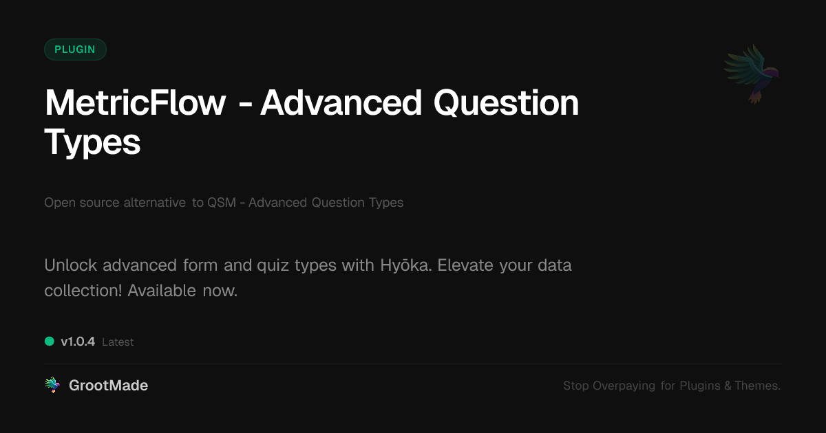 | Tags | survey tool, quiz plugin, education, advanced form fields, custom question types, blog to product sales, Learning, Quiz, Survey, Questions, Assessment, Questionnaire, Test, real estate theme functionality, Feedback, online community safety, clean shop design, pagination addon, profile tab builder, form builder, Forms, user contact form |