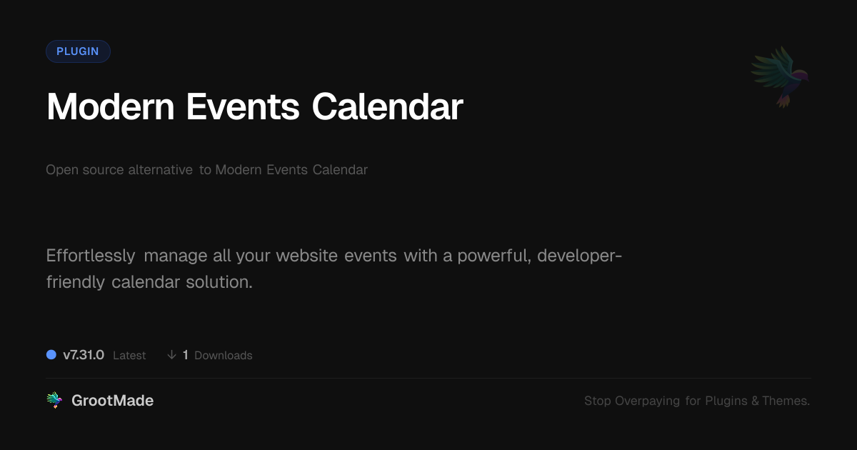 GrootMade is not affiliated with Modern Events Calendar and provides an open-source alternative.
