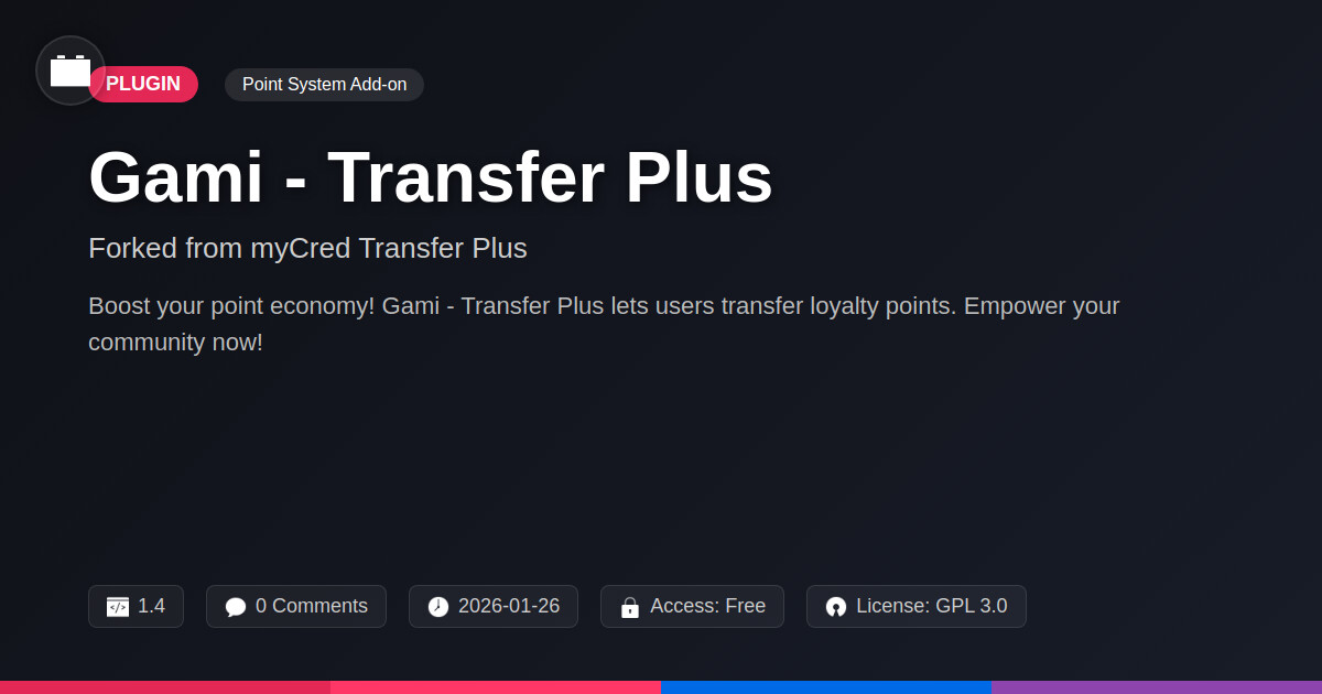 | Tags | Membership, loyalty program, community currency, digital rewards transfer, point transfer addon, site currency transfer, user to user points, mailerlite integration plugin, dashboard reporting widget, asset loading optimization, frontend performance boosters, website property listings, dynamic web elements, layered scrolling plugin, Transfer, Mycred, Points, Rewards, Virtual Currency, User Credits, Transactions, gamification, film gallery plugin, classifieds tool |