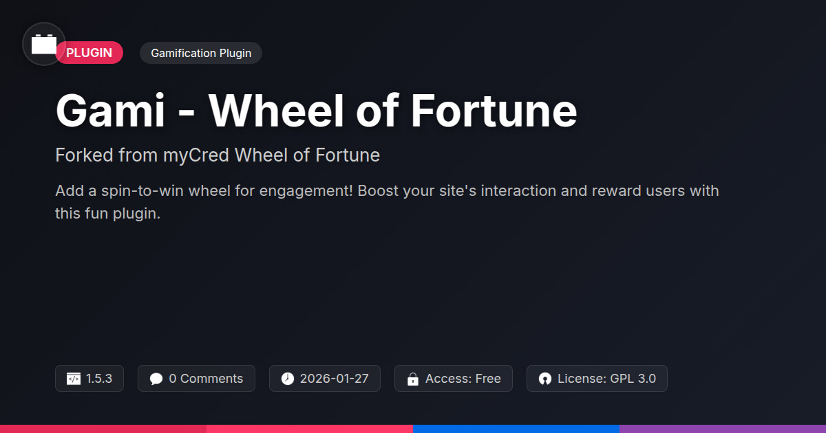 | Tags | website interactivity, gamification plugin, user interaction, loyalty program, reward system, points system, spin the wheel, payment status, website property listings, content security for websites, Rewards, Engagement, Wheel Of Fortune, Giveaways, Contests, gamification, user engagement, marketing |