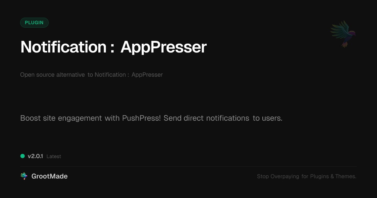 | Tags | open source alternative, user engagement tools, push notifications, mobile, app integration, site notifications, push messaging, Mobile Apps, Apppresser, WP plugin, Digital Downloads, profile tab builder, user engagement, image migration plugin, Notifications, user role visibility, Messaging, instagram gallery addon, Alerts, member communication plugin |