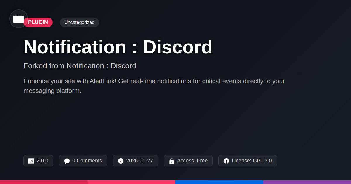 | Tags | real-time alerts, webhook, real-time updates, team collaboration, messaging integration, dynamic web elements, Messaging, Discord, automation, open source, WP plugin, Digital Downloads, profile tab builder, integration, e-commerce feature, website notifications, image migration plugin, Notifications, instagram gallery addon, Alerts |