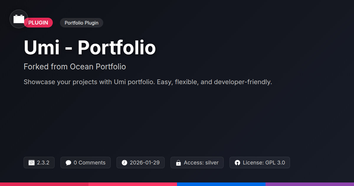| Tags | showcase plugin, gallery, photography, showcase, creative portfolio, website portfolio, WP community tools, infinite scroll plugin, cron job alternative, online content presentation, hero image slider, Design, Projects, Artist, Work, developer portfolio, portfolio plugin, online community safety, portfolio, creative, user contact form, member communication plugin |