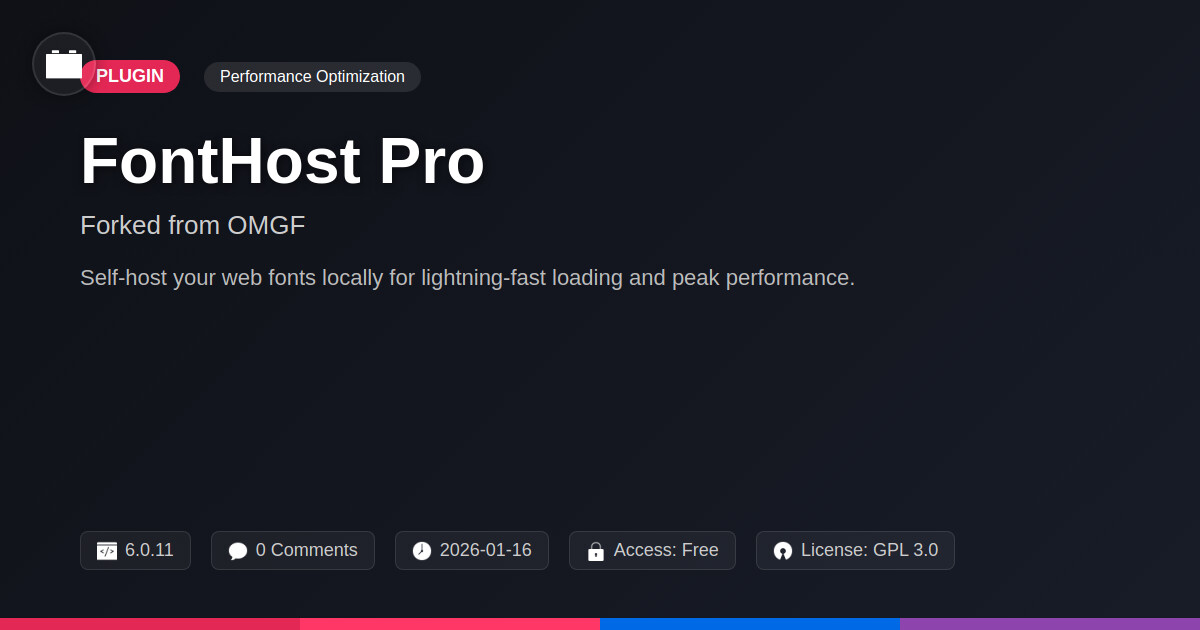 | Tags | Optimization, Css, recent profile visitors, visual asset security, local fonts, font optimization, Developer Tools, image copyright tool, web font hosting, Fonts, user contact form, Caching, profile tab builder, performance, member communication plugin, performance plugin, clan website theme, Webfonts, Google Fonts, Frontend, typography control, gallery plugin development, Speed |