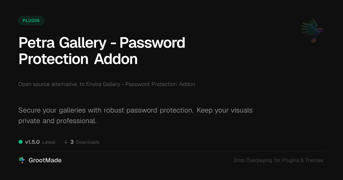 GrootMade is not affiliated with Envira Gallery - Password Protection Addon and provides an open-source alternative.