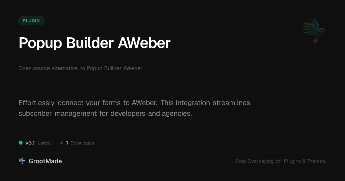 | Tags | Aweber, email marketing plugin, marketing automation, email marketing, lead generation tool, user role visibility, website form plugin, subscription forms, lead generation, email campaigns, profile tab builder, member communication plugin, aweber integration, email integration, web design utility, payment status, autoresponder, subscriber management, Newsletter, WP plugin |