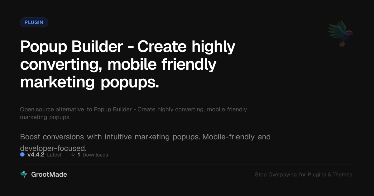 GrootMade is not affiliated with Popup Builder - Create highly converting, mobile friendly marketing popups. and provides an open-source alternative.