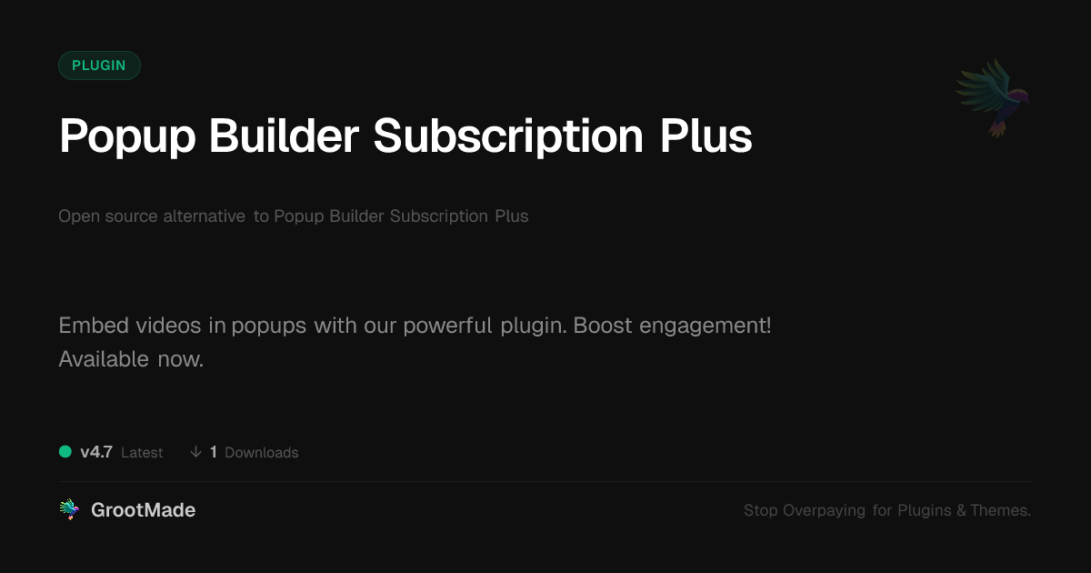 | Tags | embedded video popup, popup for videos, video embed popup, video player popup, video popup plugin, software beta testing, product likes plugin, site submission plugin, Multimedia, Video, Media, Youtube, Vimeo, Player, Embed, Lightbox, Popup, digital identity control, profile tab builder, responsive, downloadable product plugin, user contact form |