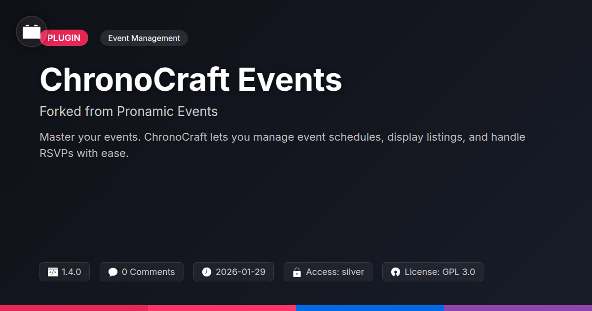 | Tags | event management plugin, event booking, open source events, website events, cms events, content spotlight plugin, developer tools plugin, Scheduling, Calendar, Organizers, Registration, Recurring Events, Timelines, Planners, multilingual website plugin, online community safety, Digital Downloads, data visualization tools, Events, event management, profile tab builder, user contact form, member communication plugin |