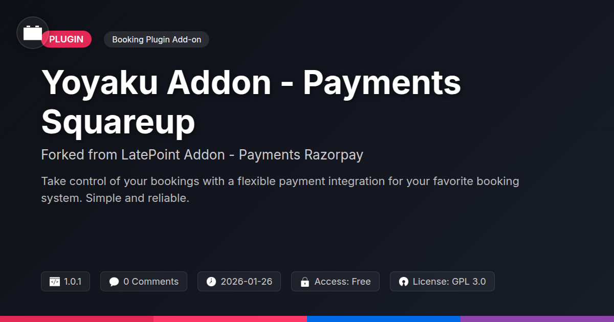 | Tags | Payment Processing, booking system integration, domain blocker, Payments, Scheduling, Appointment, Reservations, Square, Squareup, Booking, stripe payment gateway, multilingual website plugin, Payment Gateway, Online Payments, Digital Downloads, profile tab builder, Ecommerce, user role visibility |