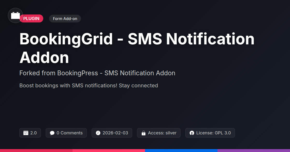 | Tags | website booking sms, directory comparison, customer communication, Notifications, Appointments, Scheduling, appointment reminders sms, user role visibility, automation, Reservations, booking management, multilingual website plugin, profile tab builder, developer booking sms, Sms, booking sms notifications, Reminders, booking plugin sms add-on, online community safety, masonry blog layout, image migration plugin, Booking |