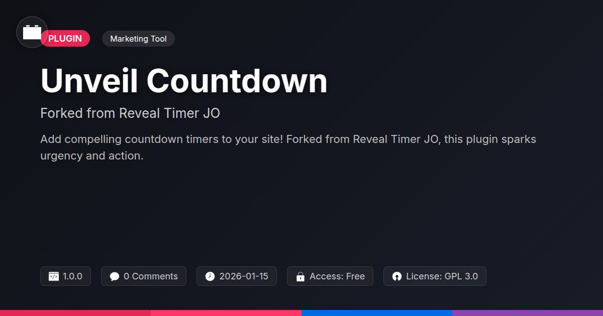 Tags Event, WC, maintenance mode, Pre Order, open source plugin, Teaser, Timer, countdown timer plugin, Coming Soon, marketing timer, Digital Downloads, website urgency tool, payment status, Launch, content spotlight plugin, product launch, Countdown