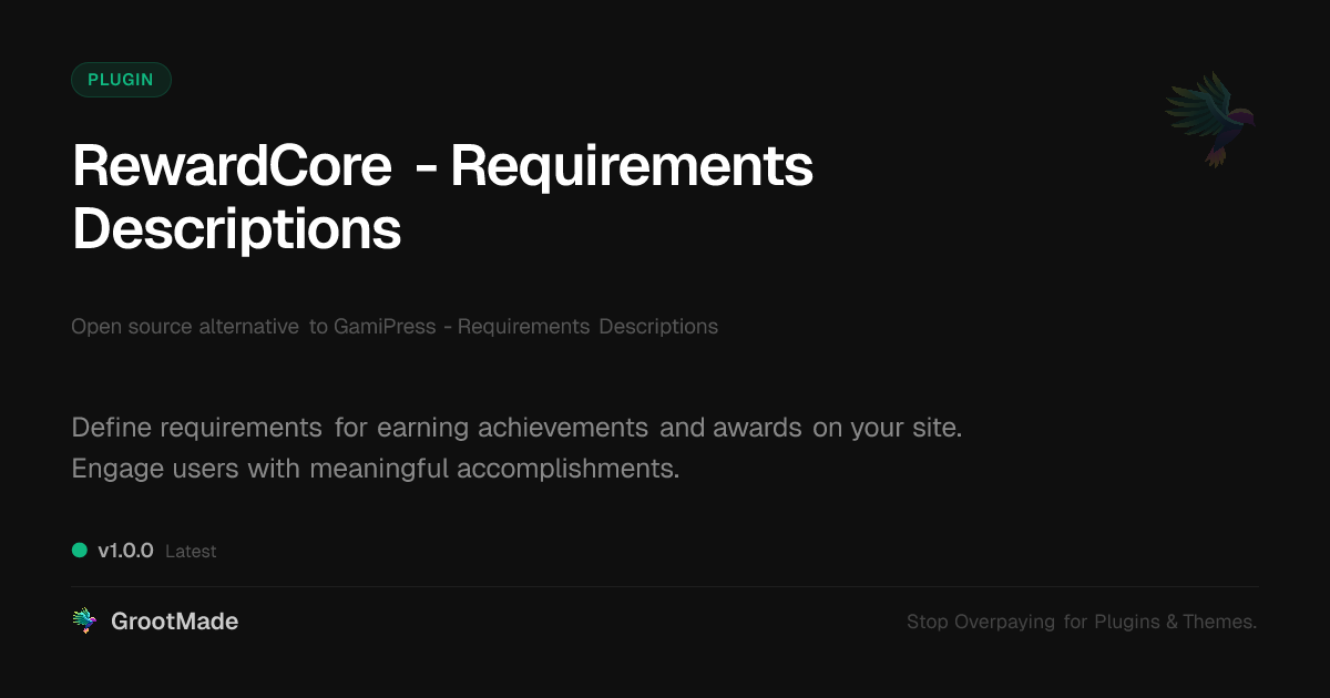 | Tags | achievement conditions, engagement requirements, gamification rules, reward prerequisites, user progress control, blog to product sales, asset loading optimization, website property listings, content security for websites, Points, Rewards, Engagement, Achievements, Badges, Motivation, Requirements, Descriptions, gamification, user experience, profile tab builder |