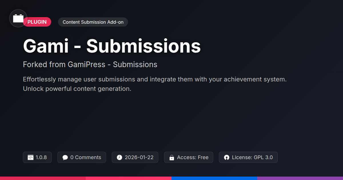 | Tags | user generated content, Content Moderation, user content submission, achievement system, gamification add-on, community contributions, blog to product sales, asset loading optimization, website property listings, developers video plugin, Points, Rewards, Submissions, Achievements, Badges, Gamipress, content management, gamification, profile tab builder, user engagement |
