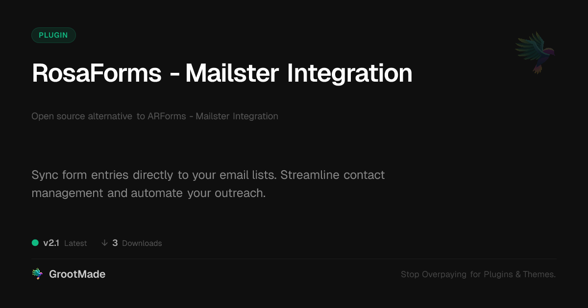 | Tags | Form to email list sync, contact form, email marketing, platform form addon, website form leads, payment status, gallery printing, Subscription, Mailster, lead generation, Newsletter, email marketing automation, WP plugin, clean shop design, pagination addon, design expansion pack, web design utility, form builder, integration, contact form integration, Forms |