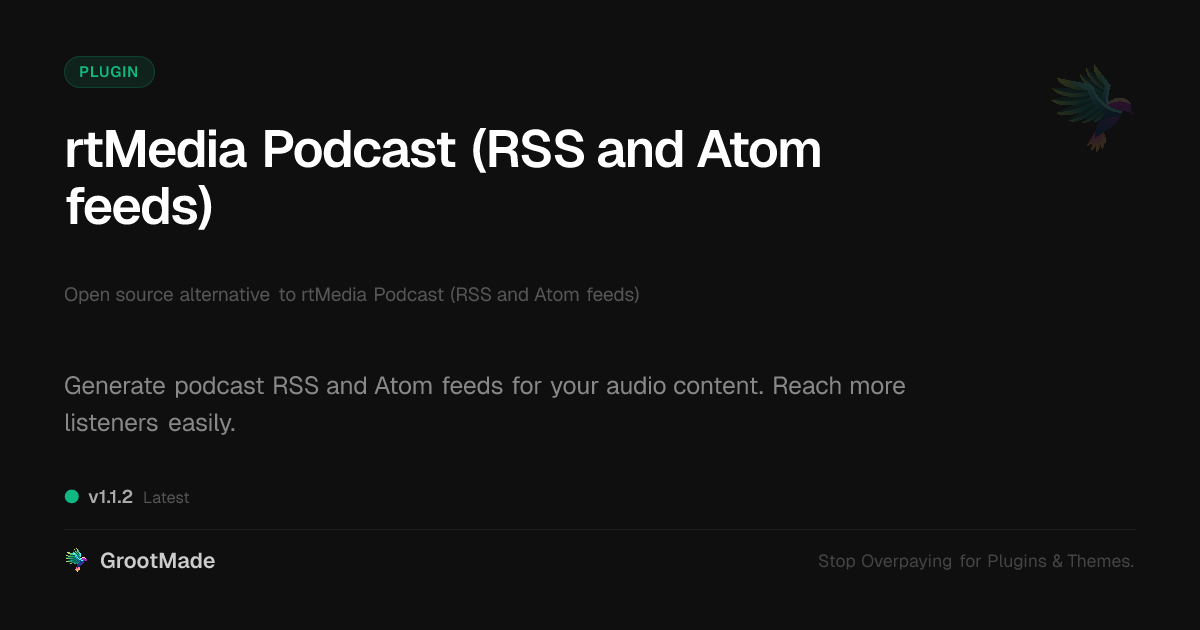 | Tags | content distribution, content syndication, atom feed generator, audio syndication, podcast rss, rss feed, product launch tool, product likes plugin, Audio, Media, Rss, Podcast, Feeds, Podcasting, Broadcasting, Atom, digital identity control, Digital Downloads, profile tab builder, downloadable product plugin |