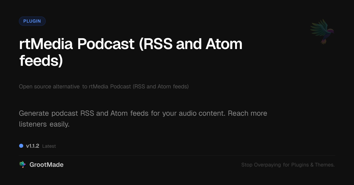 GrootMade is not affiliated with rtMedia Podcast (RSS and Atom feeds) and provides an open-source alternative.