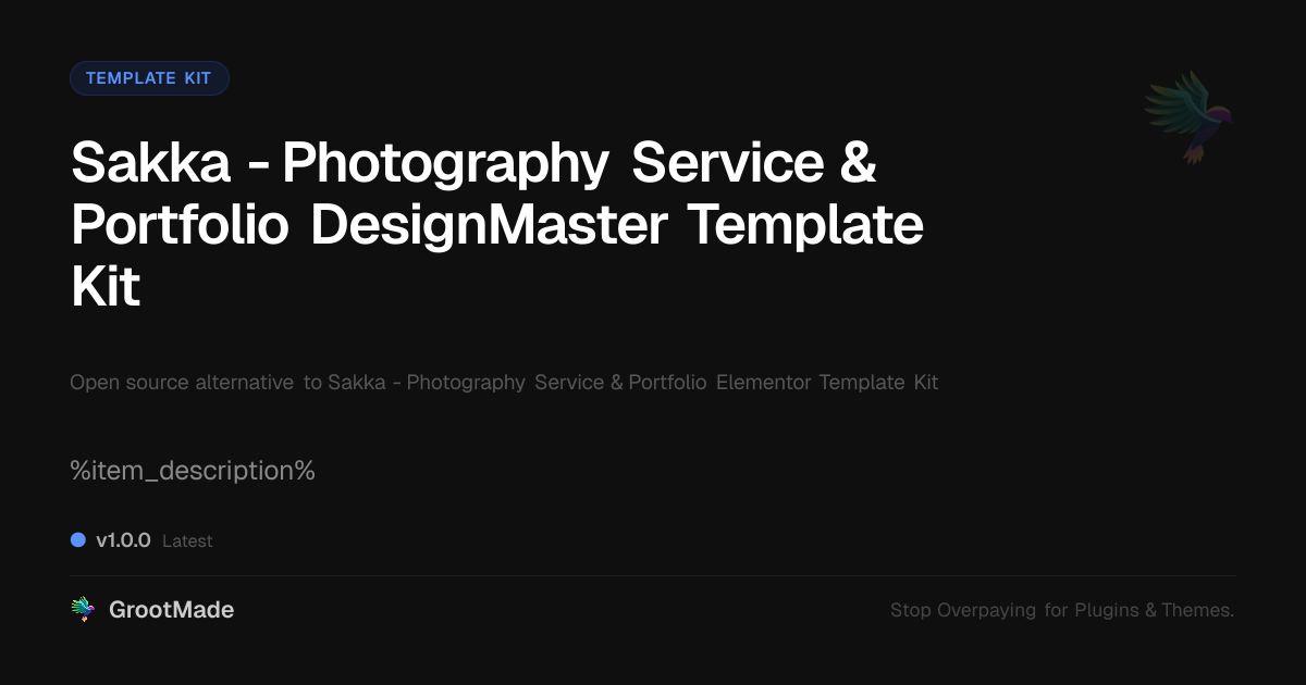 GrootMade is not affiliated with Sakka - Photography Service & Portfolio Elementor Template Kit and provides an open-source alternative.