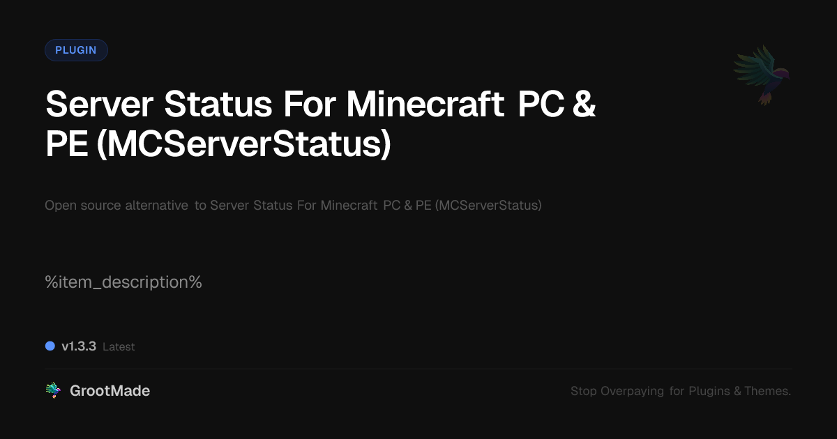 GrootMade is not affiliated with Server Status For Minecraft PC & PE (MCServerStatus) and provides an open-source alternative.