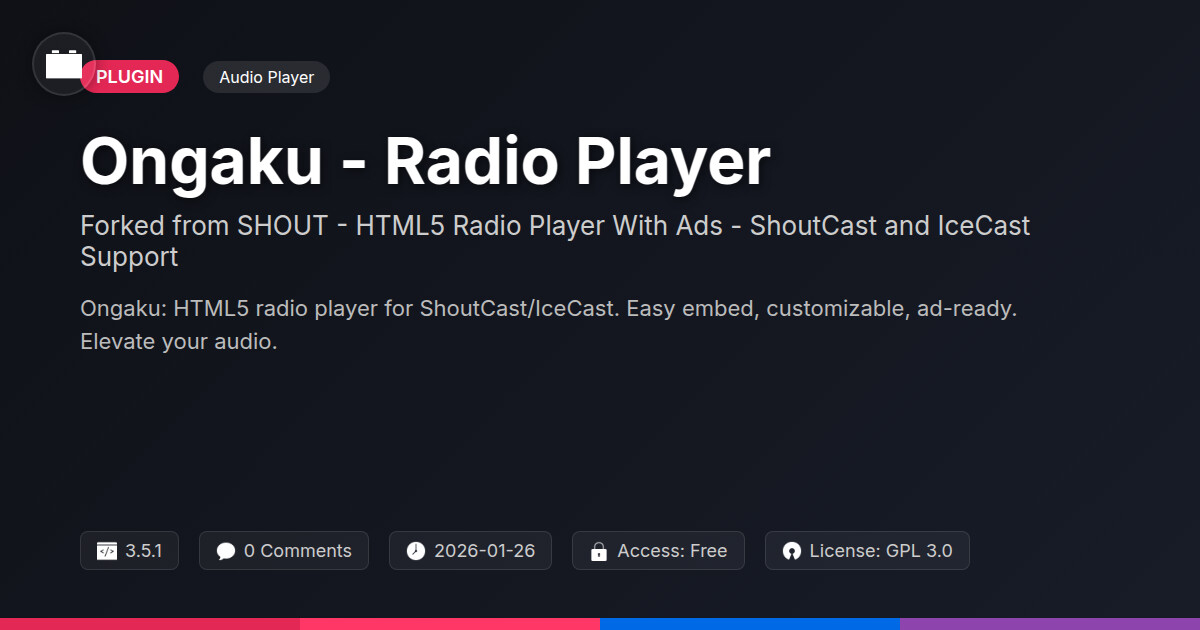 | Tags | website audio, shoutcast icecast, playlist, radio player, html5 audio, stream monetization, early access software, product launch tool, Entertainment, Audio, Radio, Player, Music, Podcast, Internet Radio, Broadcast, streaming, digital identity control, downloadable product plugin |