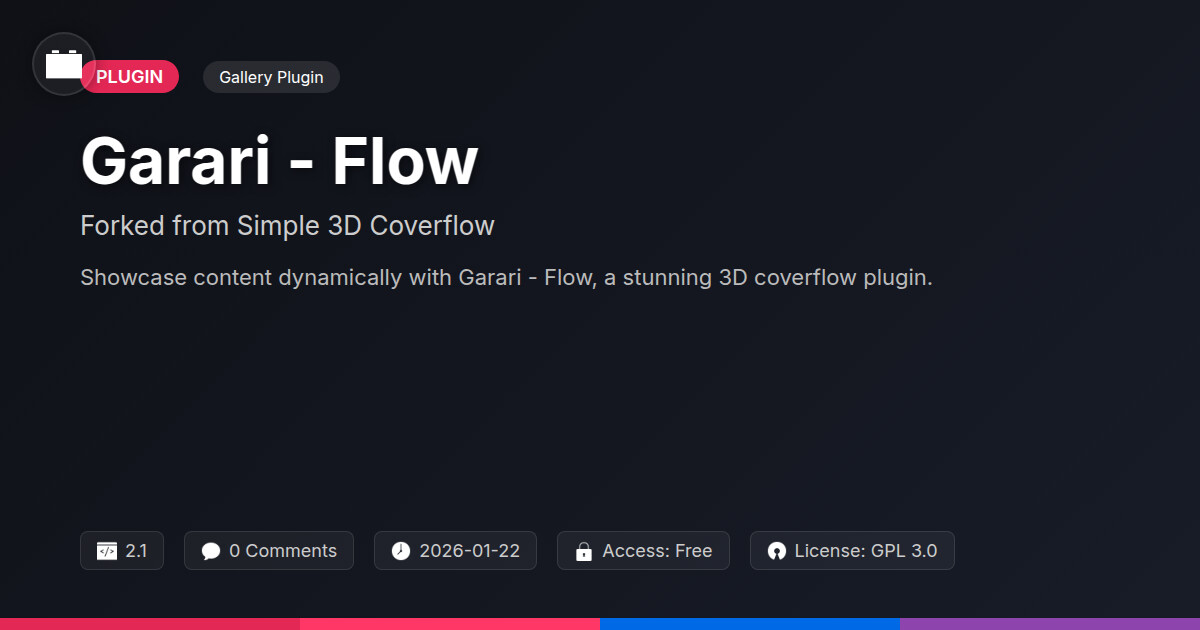 | Tags | dynamic content, visual content display, customization, web design, animation, portfolio showcase, interactive gallery, 3D gallery, coverflow plugin, WP community tools, infinite scroll plugin, clan website theme, Design, Interaction, Flow, user experience, creative, member communication plugin, user role visibility, user contact form, Frontend |