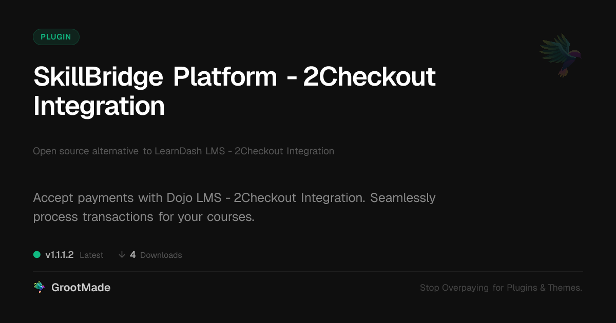 | Tags | Membership, 2Checkout Integration, online courses, lms payment gateway, online course payments, education, dojo lms add-on, e-learning payment processing, product roadmap, whiteboard animation plugin, Payments, Elearning, 2checkout, Subscription, Lms, Payment Gateway, online community safety, member profile enhancements, profile tab builder, design expansion pack, integration, user role visibility, user contact form |