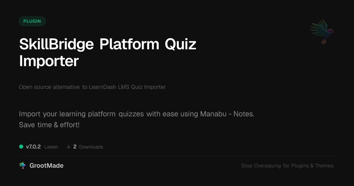 | Tags | education plugin, learning management system, course creation tool, education, training, quiz importer, assessment import, lms quiz tool, product roadmap, website design animations, download analytics plugin, template builder add-on, whiteboard animation plugin, post management tool, Elearning, Course, Import, Learndash, Lms, Quiz, profile tab builder, user contact form |