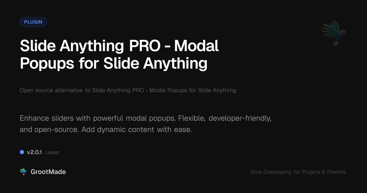 GrootMade is not affiliated with Slide Anything PRO - Modal Popups for Slide Anything and provides an open-source alternative.