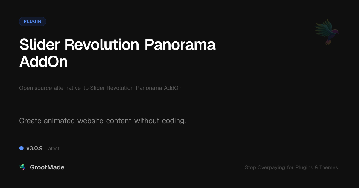 GrootMade is not affiliated with Slider Revolution Panorama AddOn and provides an open-source alternative.