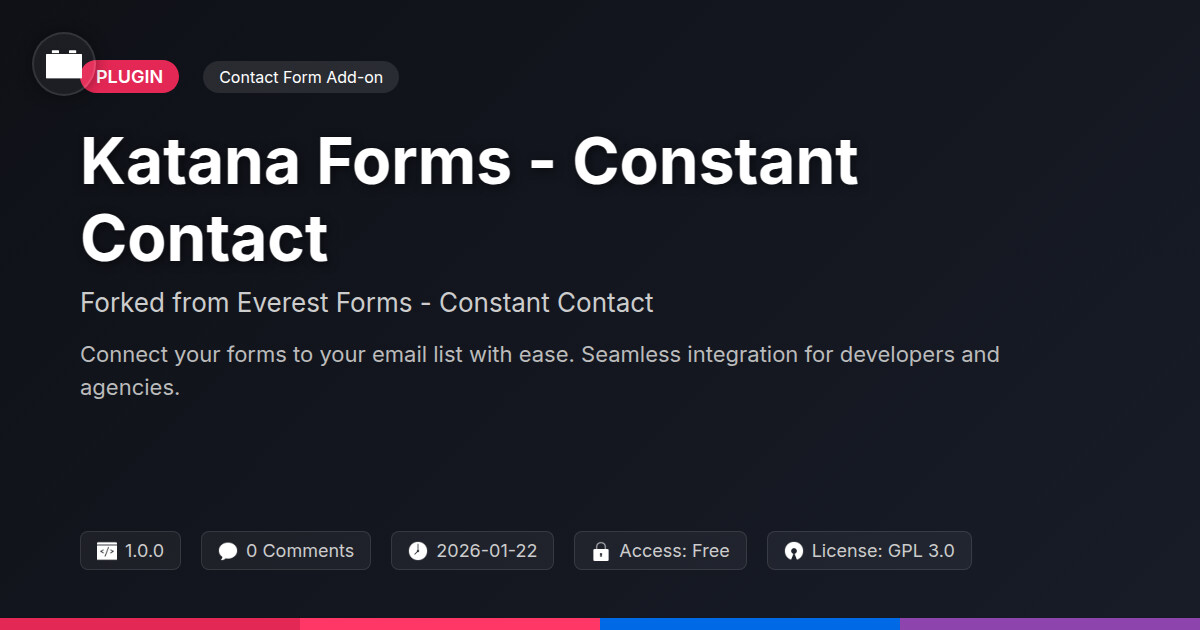 | Tags | email marketing, email marketing connector, payment status, Constant Contact, Everest Forms, lead generation, crm, Newsletter, marketing automation, digital identity control, developer tool, contact forms, pagination addon, profile tab builder, web design utility, form builder, integration, lead generation tool, contact form integration, agency solution, user role visibility, user contact form |