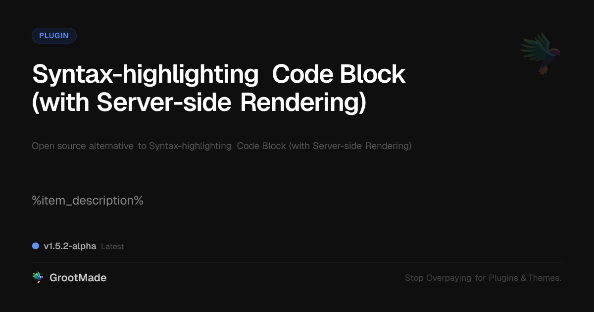 GrootMade is not affiliated with Syntax-highlighting Code Block (with Server-side Rendering) and provides an open-source alternative.