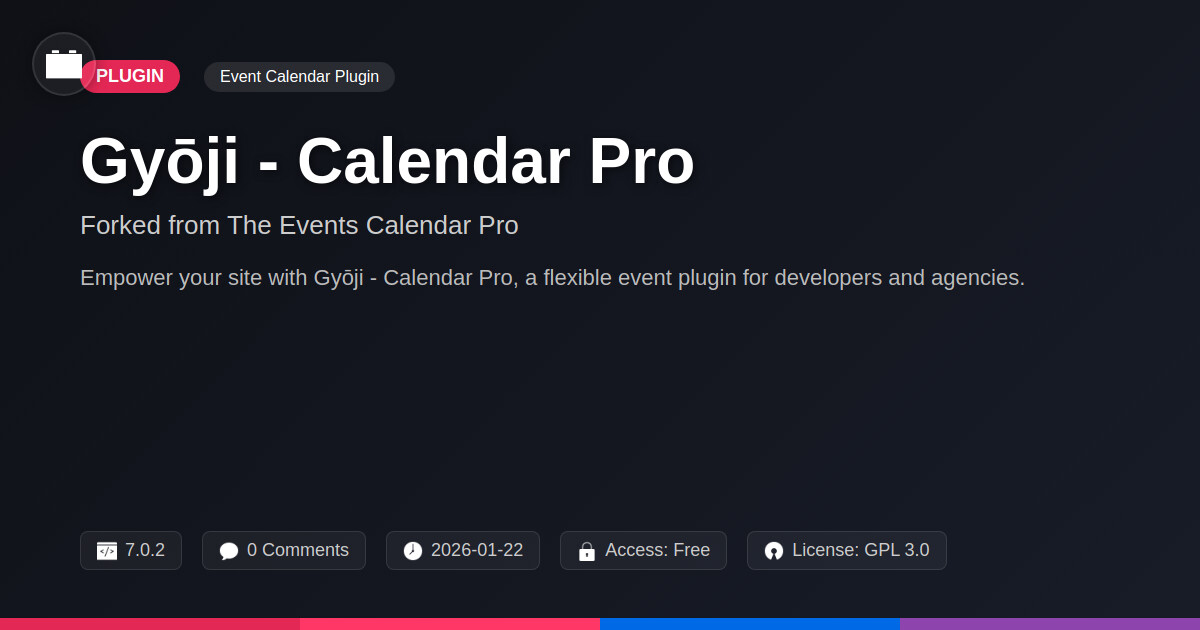 | Tags | open source events, event calendar plugin, event display, customization, agency event calendar, WP events plugin, event tickets, advanced features, venue management, translation workflow, developer tools plugin, site creator, Scheduling, Premium, Pro, Calendar, Recurring Events, Organizer Tools, multilingual website plugin, data visualization tools, Events, event management, event registration, profile tab builder, Widgets, user role visibility, user contact form, developer event manager |