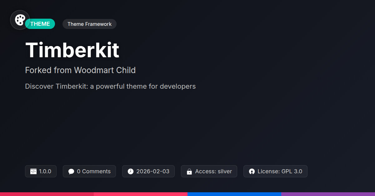| Tags | Timber, Woodworking, Craftsmanship, customizer, performance optimization, theme options, developer friendly, Artisan, infinite scroll plugin, Design, agency theme, developer theme, open source theme, theme framework, Minimalist, portfolio, business, blog, creative, modern, responsive, online community safety, user role visibility, WP community tools, member communication plugin |