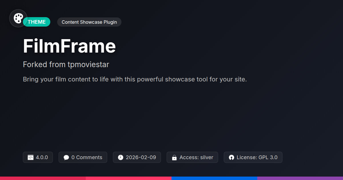 | Tags | visual content plugin, gallery, photography, content presentation tool, software beta testing, image display plugin, media showcase plugin, Video, Feed Aggregation, Film, Cinema, Movie, Filmmaker, Videography, film gallery plugin, downloadable product plugin, creative, portfolio, WP community tools |