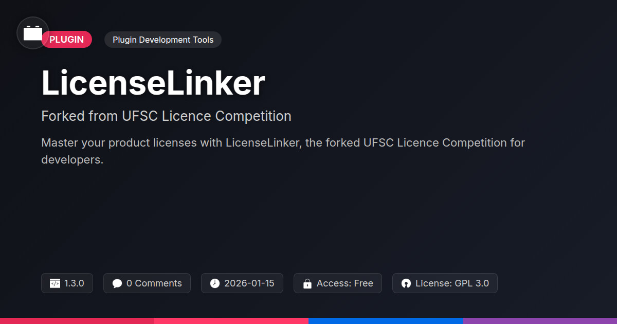 | Tags | software licensing, license management, code protection, open source license, education, e-commerce plugin features, skrill integration, slide display plugin, University, Students, Academic, Competition, Brazil, Registration, Licence, Ufsc, online community safety, Digital Downloads, clean shop design, profile tab builder, Forms, user contact form |