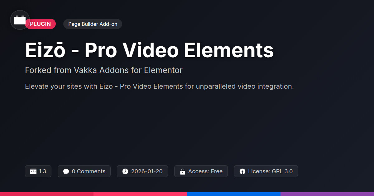 | Tags | elementor add-on, video embedding, video elements, video showcase, video gallery, media library, video player, pro video elements, web design video, WP community tools, multilingual theme, Multimedia, Video Content, Video Portfolio, Pro Video, Digital Downloads, user role visibility, member communication plugin, user contact form, page builder video |