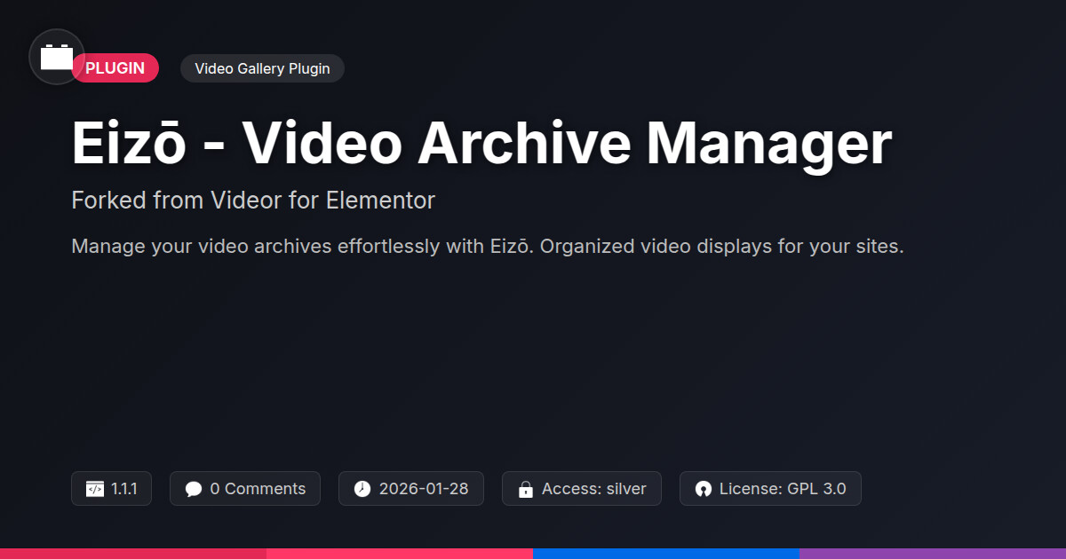 | Tags | gallery, Elementor video widget, custom video display, video archive manager, video asset management, WP video gallery, software beta testing, frontend product feedback, product likes plugin, store analytics tool, morphing animations, Video, Media, Library, Organization, Content, Player, Archive, streaming, Management, profile tab builder, downloadable product plugin, user contact form |