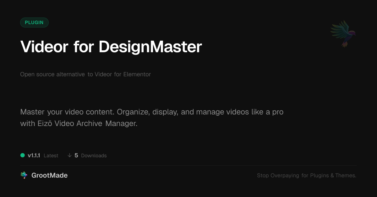 | Tags | gallery, Elementor video widget, custom video display, video archive manager, video asset management, WP video gallery, software beta testing, frontend product feedback, product likes plugin, store analytics tool, morphing animations, Video, Media, Library, Organization, Content, Player, Archive, streaming, Management, profile tab builder, downloadable product plugin, user contact form |