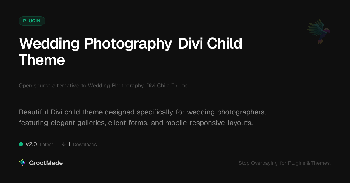 | Tags | responsive design, wedding theme, child theme, content spotlight plugin, photography theme, Deployment, Wedding Website, Divi, Photography Portfolio, Divi Builder, Wedding Photography, Event Photography, WP community tools, user role visibility |