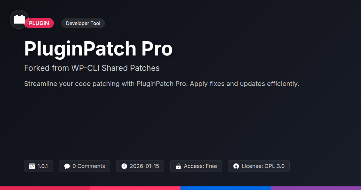 | Tags | agency workflow, code patching tool, developer, command line management, developer CLI, open source patches, cms financial tool, Security, Maintenance, WP Tools, Updates, Backups, Patches, performance, automation, plugin, profile tab builder, user role visibility, member communication plugin, user contact form |