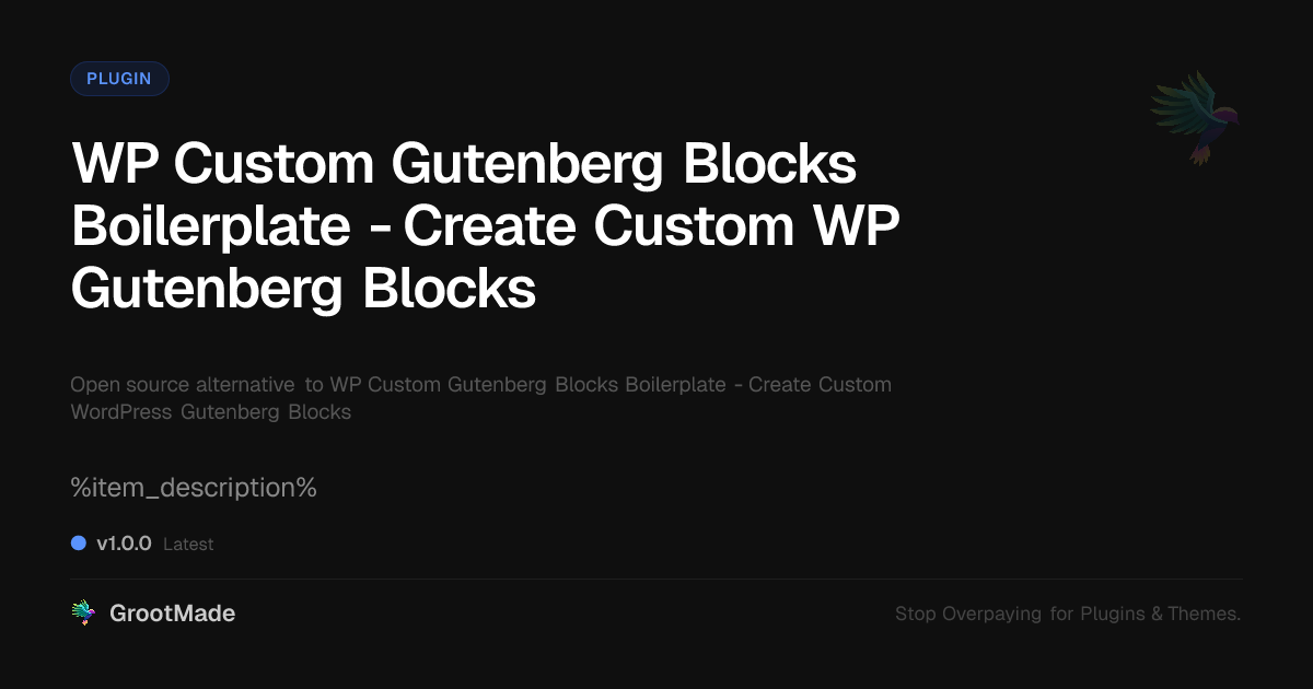 GrootMade is not affiliated with WP Custom Gutenberg Blocks Boilerplate - Create Custom WP Gutenberg Blocks and provides an open-source alternative.