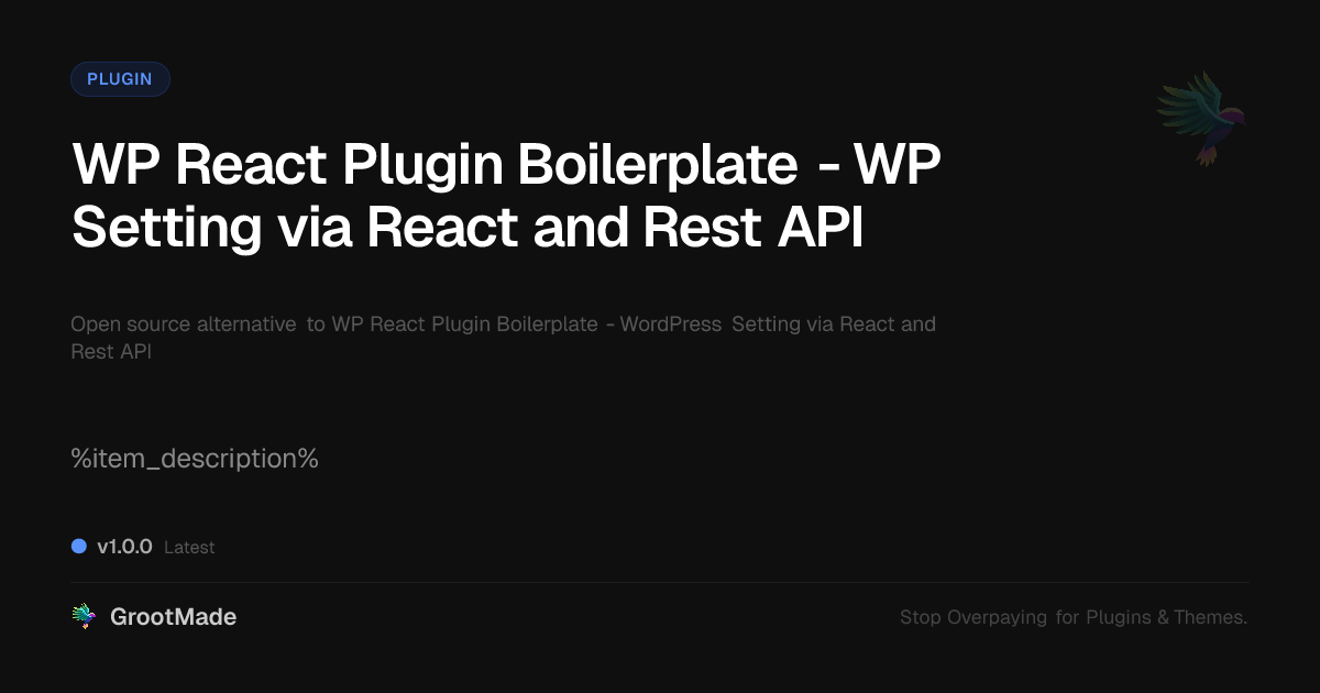 GrootMade is not affiliated with WP React Plugin Boilerplate - WP Setting via React and Rest API and provides an open-source alternative.