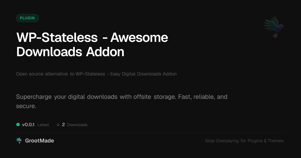 | Tags | digital products, Cdn, Downloads, e-commerce storage, WP media, secure digital assets, Digital Downloads, performance, mailerlite integration plugin, Stateless, media library, digital identity control, downloadable product plugin, GA4 server-side tracking, cloud storage, File Storage, download acceleration, Google Cloud, offsite file hosting |