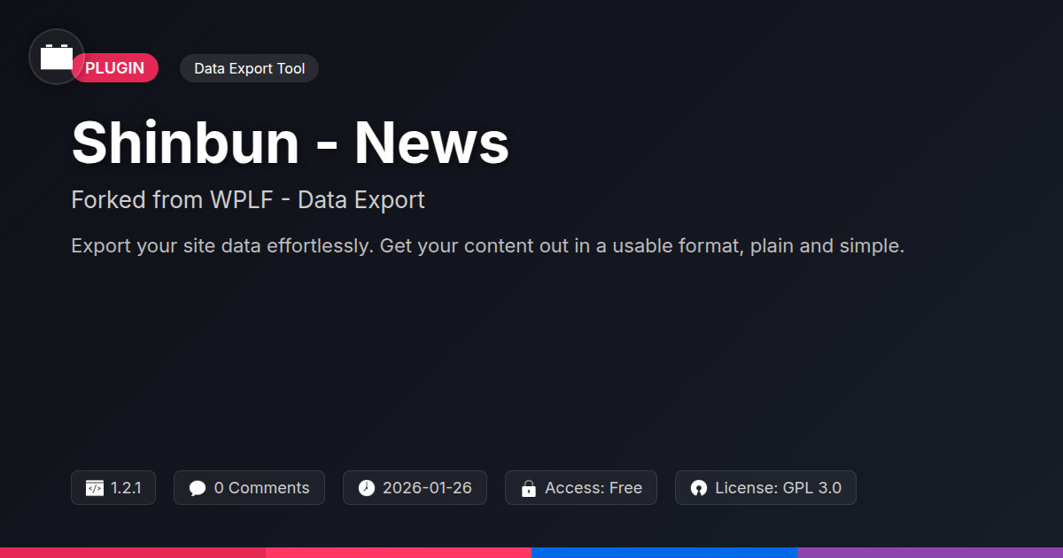 | Tags | site data management, data export plugin, content export tool, website data migration, export website content, WP custom fields, download monitor integration, php script repository, product likes plugin, morphing animations, News, Journalism, Media, Content, Posts, Rss, Publishing, Headlines, Articles, recent profile visitors, blog, user contact form |