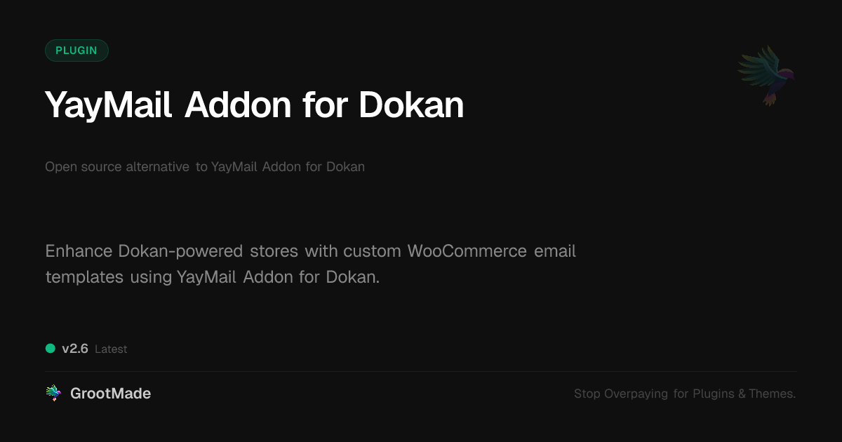 | Tags | customization, transaction data tool, gallery discoverability, image find plugin, customizable wp theme, Vendor, Marketplace, Order, Templates, Email, Dokan, product metadata indexing, payment export cli, member profile enhancements, WC, Ecommerce, image migration plugin, Notifications, user role visibility |