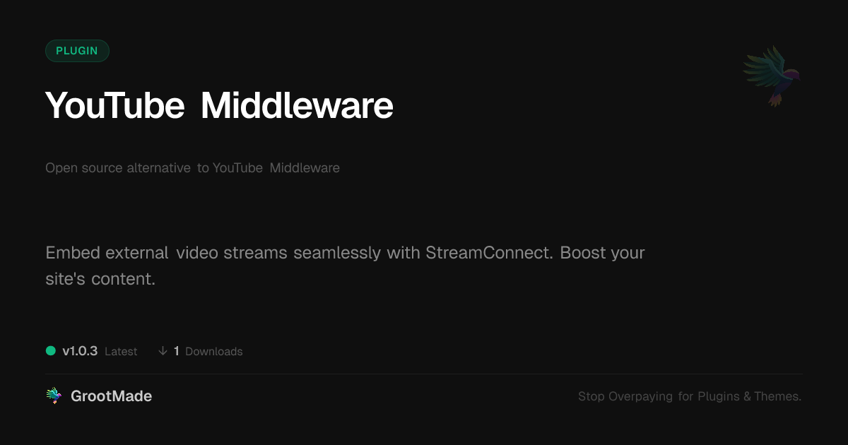 | Tags | site enhancement, content integration, stream tool, video embed, software beta testing, downloadable product plugin, payment status, image metadata display, product likes plugin, site submission plugin, morphing animations, Video, Api, Media, Youtube, Content, Player, Embed, Middleware, streaming, open source plugin, profile tab builder, integration, user contact form |