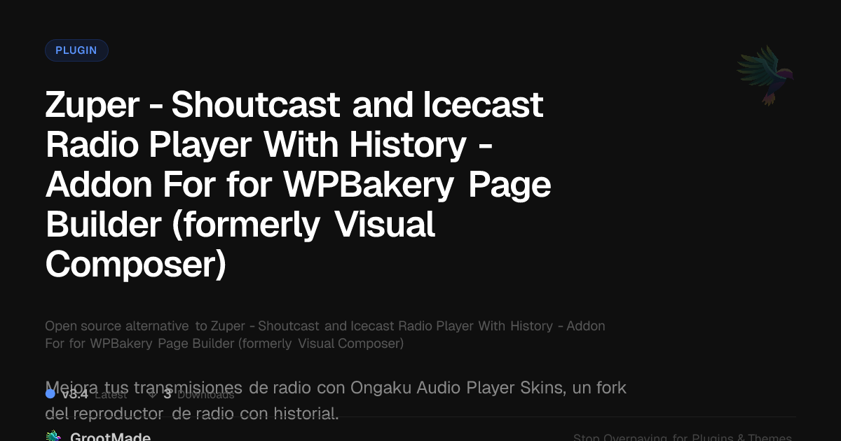 GrootMade is not affiliated with Zuper - Shoutcast and Icecast Radio Player With History - Addon For for WPBakery Page Builder (formerly Visual Composer) and provides an open-source alternative.
